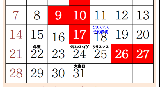 3(水)、9(火)、10(水)、17(水)、26(金)、27(土)の予定です。