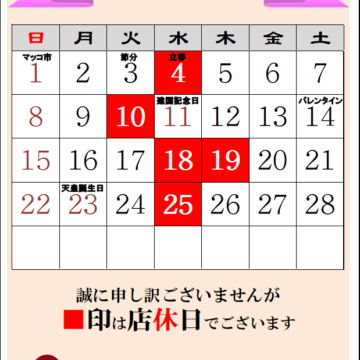 2月の店休日のお知らせです。 4(水)、10(火)、18(水)、19(木)、25(水)の予定です。 よろしくお […]