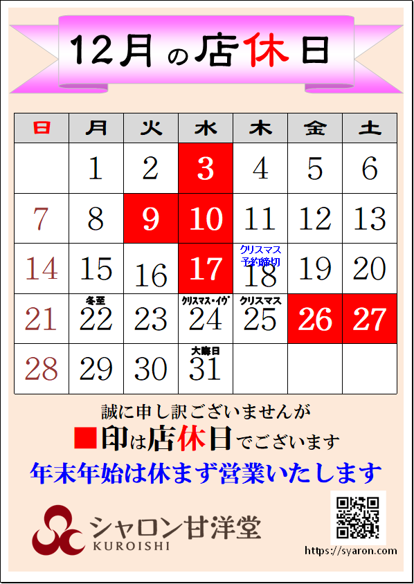 12月の店休日のお知らせです。